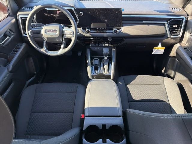 Canyon Safety Plus Package (Blind Zone Steering Assist with Trailering, Rear Cross Traffic Braking, and Ultrasonic Rear Park Assist), 1 Rear USB Port in Center Console (Charge-Only), 2 1st Row USB Charge/Data Ports, 3.42 Rear Axle Ratio, 4-Way Manual Front Passenger Seat Adjuster, 4-Wheel Disc Brakes, 6 Speakers, 6-Speaker Audio System Feature, 6-Way Manual Driver Seat Adjuster, ABS brakes, Air Conditioning, Alloy wheels, AM/FM radio, Apple CarPlay/Android Auto, Auto High-beam Headlights, Automatic Emergency Braking, Automatic Stop/Start, Brake assist, Bumpers: body-color, Canyon Pro Safety, Cloth Seat Trim, Compass, Delay-off headlights, Driver door bin, Driver vanity mirror, Dual front impact airbags, Dual front side impact airbags, Electronic Stability Control, Emergency communication system: OnStar, Following Distance Indicator, Forward Collision Alert, Front anti-roll bar, Front Bucket Seats, Front Center Armrest, Front Passenger Seatback Map Pocket, Front Pedestrian and Bicyclist Braking, Front wheel independent suspension, Heated door mirrors, Illuminated entry, IntelliBeam Automatic High Beam on/Off, Lane Keep Assist with Lane Departure Warning, Low tire pressure warning, Navigation System, Occupant sensing airbag, Off-Road Suspension, Outside temperature display, Overhead airbag, Overhead console, Panic alarm, Passenger door bin, Passenger vanity mirror, Power door mirrors, Power steering, Power windows, Radio data system, Radio: 11.3 Diagonal Premium GMC Infotainment System, Rear reading lights, Rear step bumper, Rear window defroster, Remote keyless entry, Security system, SiriusXM with 360L, Speed control, Speed-sensing steering, Split folding rear seat, Steering wheel mounted audio controls, Stop/Start System Disable Button Engine Control, Tachometer, Tilt steering wheel, Traction control, Trip computer, Variably intermittent wipers, Wheels: 18 x 8.5 Gloss Black Finish Aluminum, and Wireless Apple CarPlay/Wireless Android Auto.