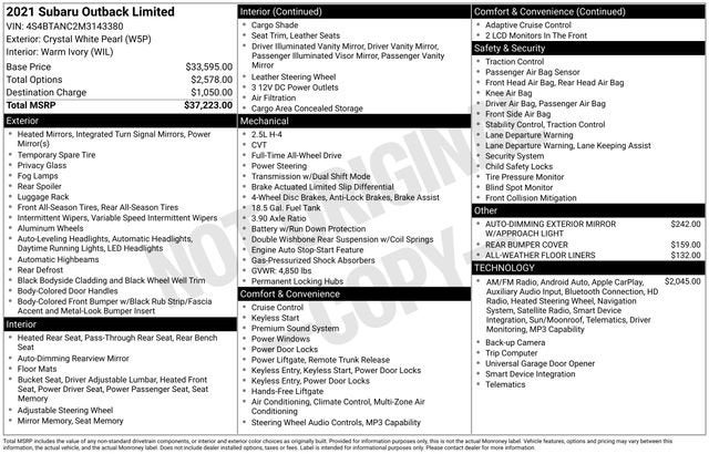 Discover the perfect blend of capability, comfort, and convenience with this 2021 Subaru Outback Limited. Boasting a refined 2.5L 4-cylinder DOHC 16V engine paired with Subaru's renowned Lineartronic CVT and Symmetrical All-Wheel Drive system, this Outback delivers exceptional performance and all-weather confidence.- All-Weather Floor Liners- Rear Bumper Cover- Auto-Dimming Exterior Mirror w/Approach Light- Power Moonroof & Heated Steering Wheel & Navigation SystemElevate your driving experience with the Outback Limited's premium features, including the impressive 11.6 STARLINK Multimedia Navigation System, Driver Focus Distraction Mitigation, and a heated steering wheel. Enjoy the convenience of a power liftgate, remote keyless entry, and steering wheel-mounted controls.Comfort and style come together in the Outback's spacious, well-appointed cabin. Sink into the perforated leather-trimmed upholstery, with heated front and rear seats providing year-round comfort. The power driver's seat and memory settings ensure a personalized fit, while the dual-zone automatic climate control keeps everyone comfortable.Safety is a top priority, with features like Subaru's advanced EyeSight Driver Assist Technology, four-wheel disc brakes with ABS, and a comprehensive airbag system. You can drive with confidence, knowing your Outback is equipped to protect you and your passengers.With an EPA-estimated 26 city/33 highway MPG, this Outback Limited delivers impressive fuel efficiency to complement its exceptional capability. Whether tackling your daily commute or embarking on a weekend adventure, this versatile Subaru is ready to take you there in style and comfort.Experience the exceptional craftsmanship, advanced technology, and uncompromising performance of the 2021 Subaru Outback Limited. Visit our showroom today to take this remarkable vehicle for a test drive and discover why it's the perfect companion for your active lifestyle.This vehicle is located at Navarre Chevrolet, 1300 East College Street, Lake Charles, LA 70607. Please call any of our Sales Professionals at 337-474-1999 for more details or to set an appointment.Visit our website http://www.navarreauto.com for more New, Pre-Owned, and Chevrolet Certified Specials!