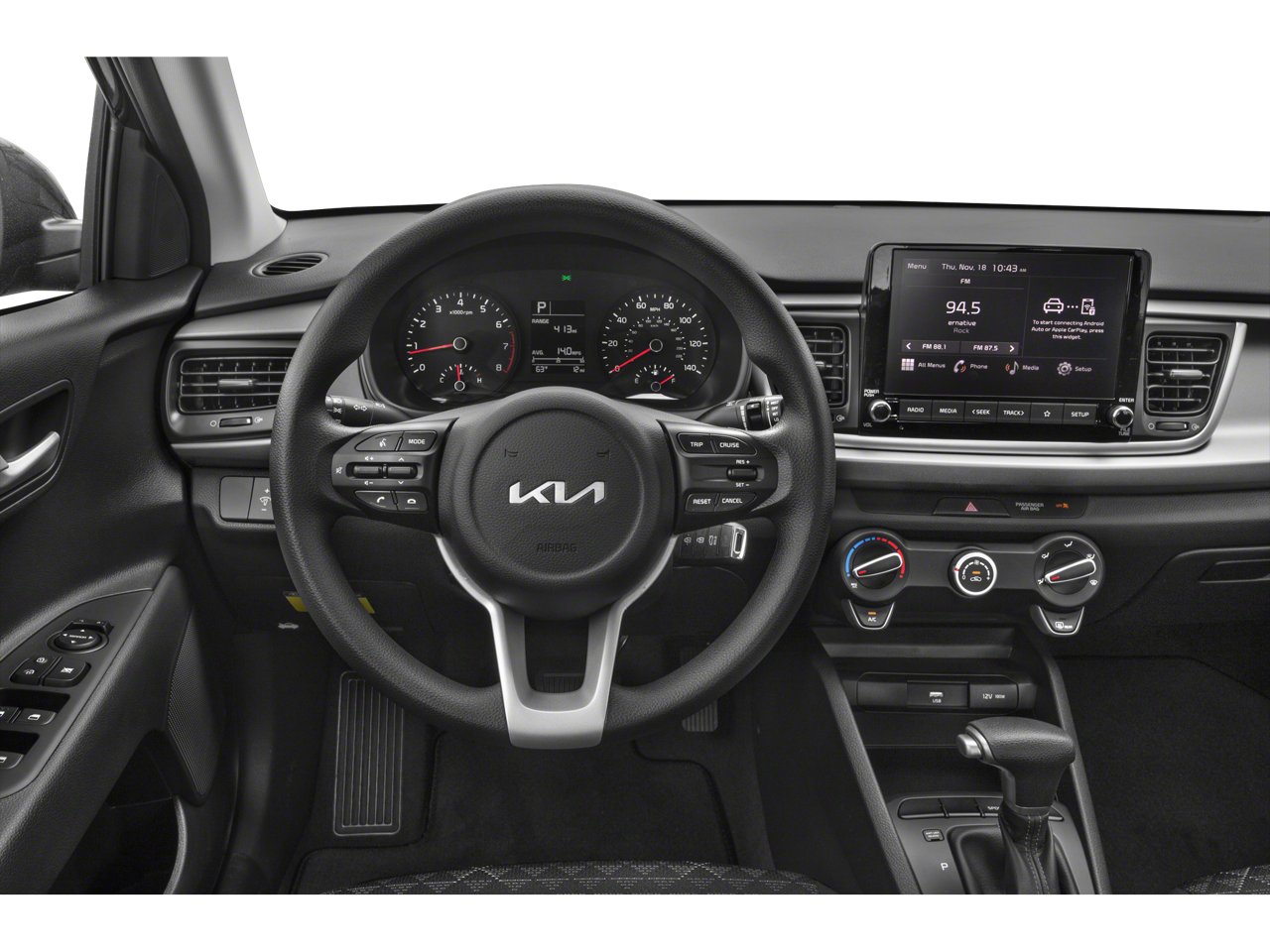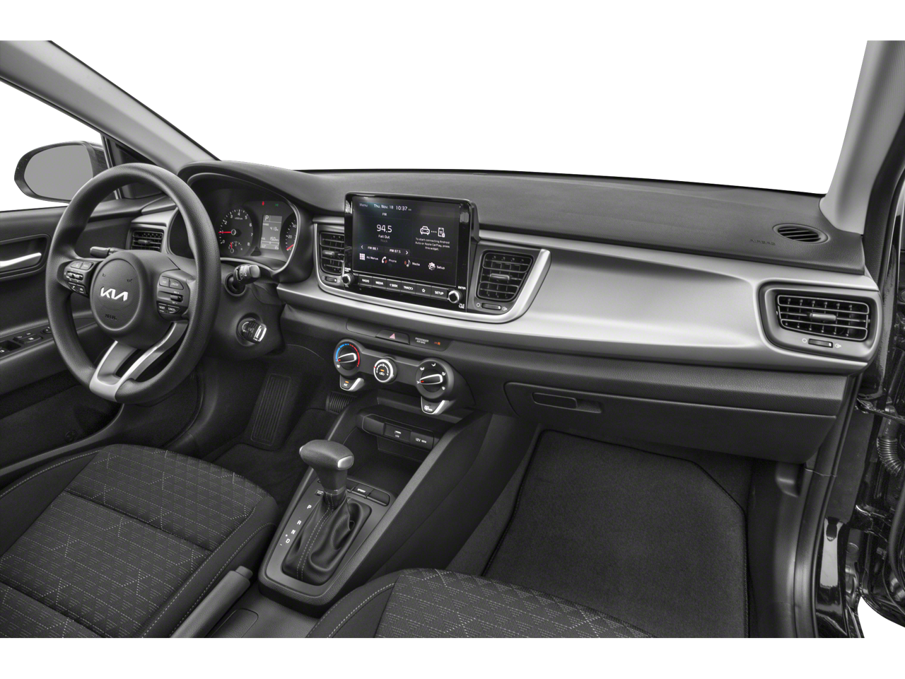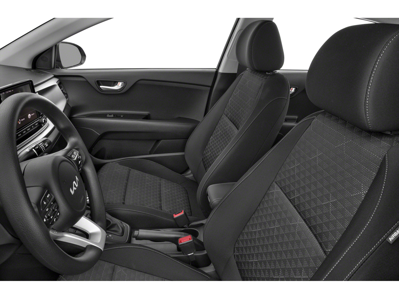 The Rio's interior is thoughtfully designed, with ample passenger space and a versatile split-folding rear seat that allows you to accommodate your ever-changing cargo needs. The woven and tricot cloth seat trim provides a touch of sophistication, while the front bucket seats and center armrest ensure a comfortable driving experience.